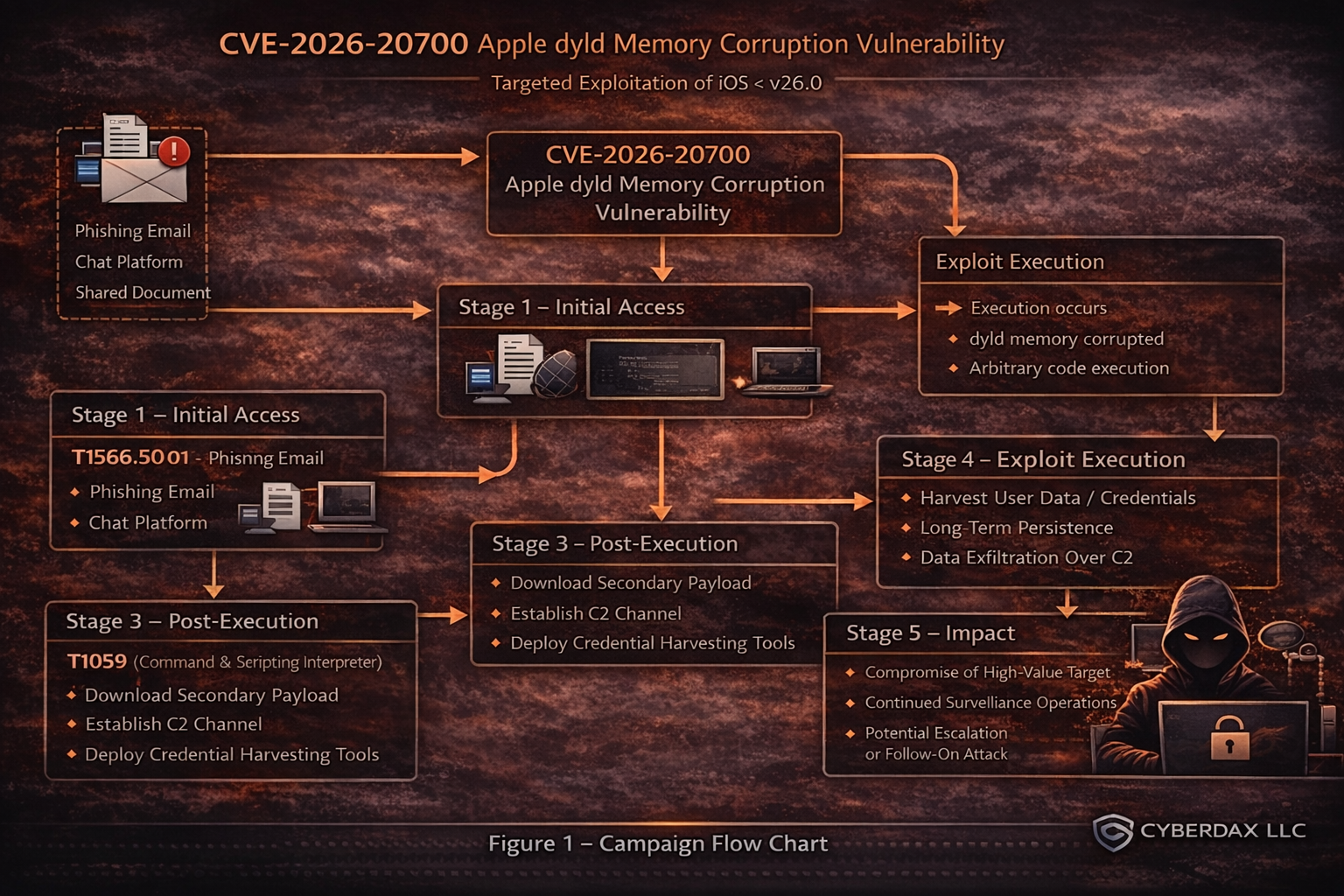 o Dyld sits at a critical boundary for loading code; successful exploitation can enable implant staging, credential access, or surveillance operations depending on the rest of the chain.