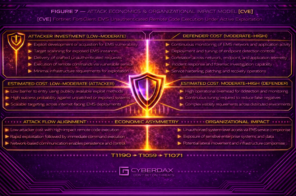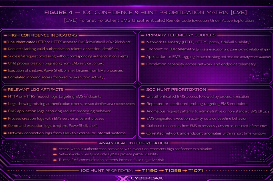Fortinet FortiClient EMS contains an unauthenticated remote code execution vulnerability that enables compromise of centralized endpoint management infrastructure, creating high-impact enterprise risk due to its control over managed systems. The vulnerability is caused by improper access control (CWE-284), allowing attackers to bypass authentication and execute commands directly against EMS services. Inclusion in the CISA Known Exploited Vulnerabilities catalog indicates elevated exploitation likelihood and compressed timelines for attacker adoption. Immediate remediation, enforced access restriction, and validation of detection capability are required to prevent enterprise-wide compromise.