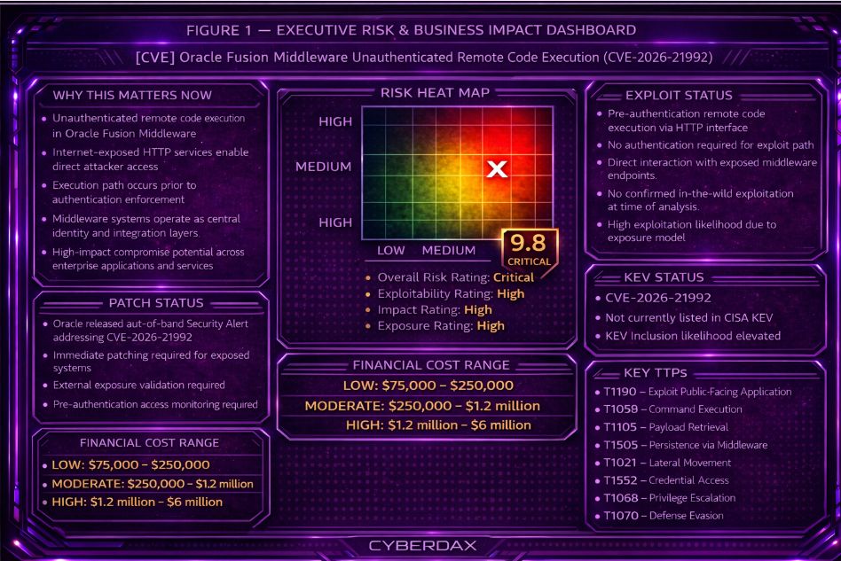 The economic impact of CVE-2026-21992 is driven primarily by its ability to enable unauthenticated remote code execution within Oracle Fusion Middleware environments that frequently support identity governance and service control functions. This creates a direct pathway to disruption of authentication workflows, service orchestration, and enterprise application access.
