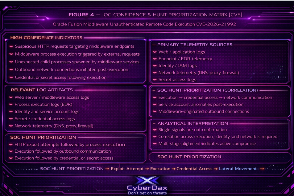 CVE-2026-21992 represents a strategic risk to organizations that rely on Oracle Fusion Middleware for identity governance and service orchestration due to its ability to compromise control-plane systems without authentication. This shifts risk from isolated system compromise to systemic exposure affecting authentication integrity, service trust, and enterprise access control.