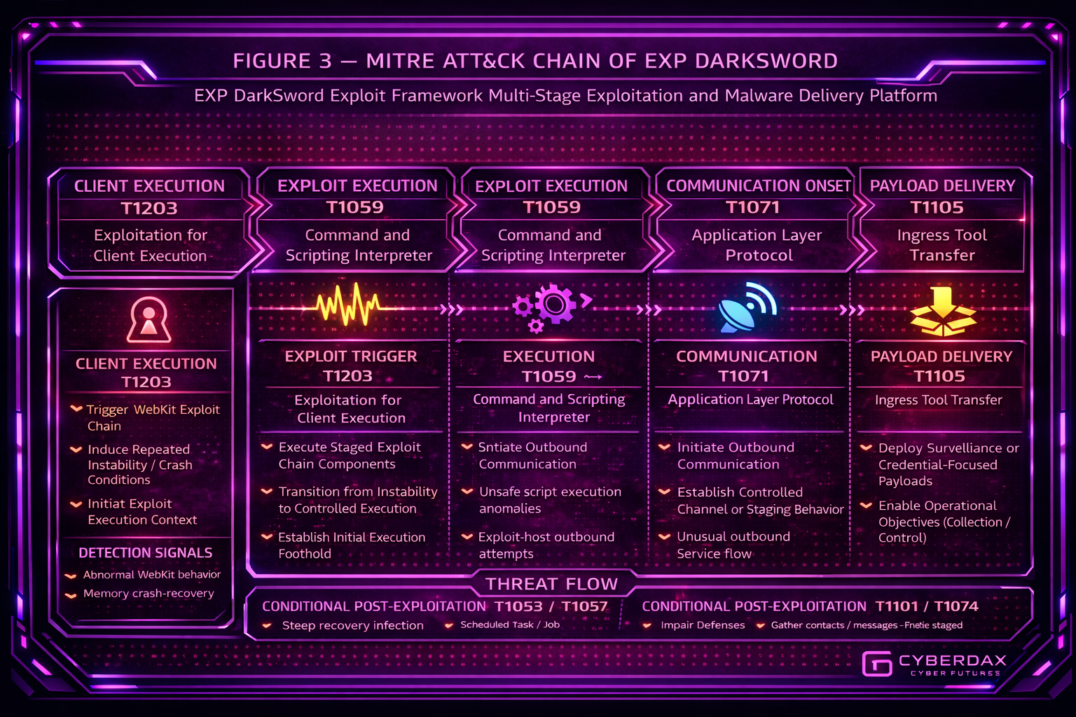 DarkSword is a multi-stage iOS exploit framework that chains multiple vulnerabilities, including zero-days, to achieve full device compromise and enable controlled delivery of post-exploitation malware. The framework executes coordinated exploit stages across WebKit, user-space, and kernel layers to bypass platform protections, escalate privileges, and establish execution control prior to payload deployment. This design minimizes observable indicators during initial compromise and enables device takeover without traditional malware delivery artifacts or user interaction.