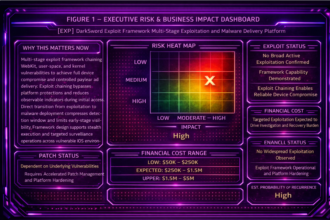 The DarkSword exploit framework presents a material business risk by enabling full-chain device compromise that can lead to covert surveillance, credential theft, and exposure of sensitive or regulated data through downstream malware deployment. The technical cause is a multi-stage exploit chain that leverages vulnerability exploitation to achieve initial access, privilege escalation, and controlled payload delivery within targeted environments. Current threat posture indicates elevated operational risk because exploit chaining can limit early observable indicators and create a direct path from vulnerability exposure to malware delivery. Executive action should prioritize platform hardening, accelerated vulnerability remediation, and deployment of behavior-based detection across endpoint and network telemetry.