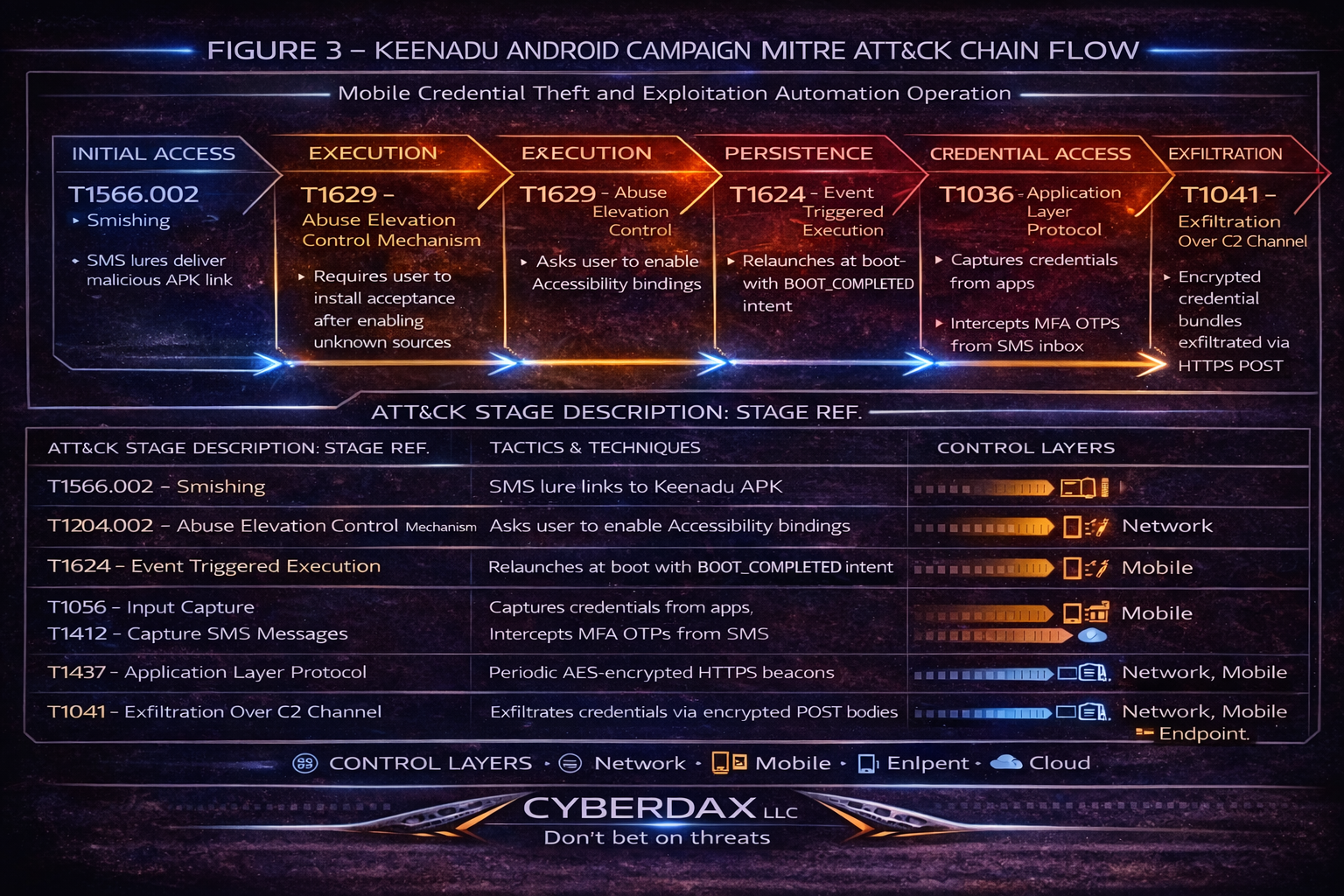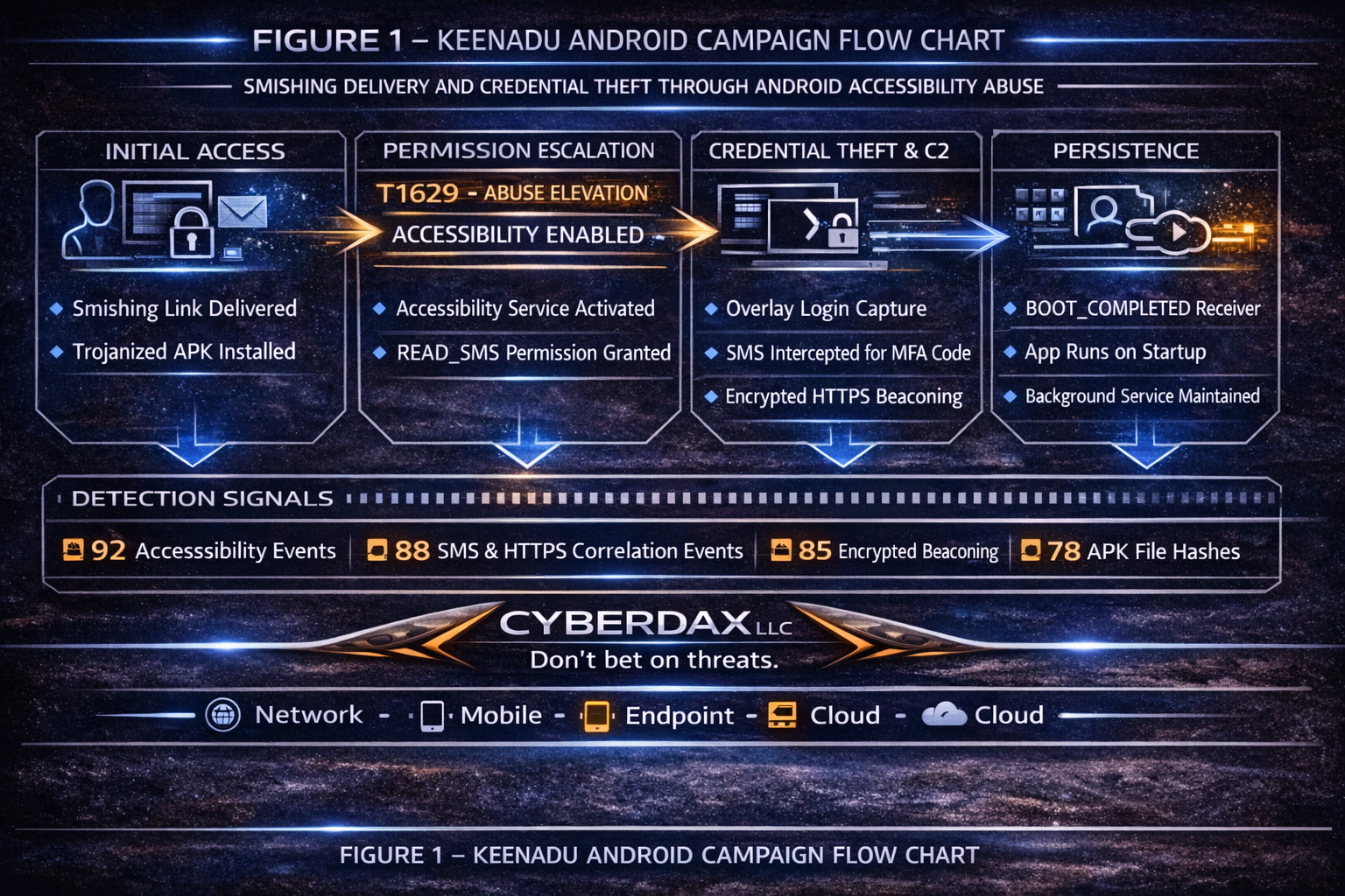 Keenadu is a modular Android backdoor that abuses Accessibility Services and SMS permissions to capture credentials, intercept SMS-based multi-factor authentication codes, deploy overlay-based credential harvesting against financial and enterprise applications, and maintain encrypted HTTPS command and control persistence.